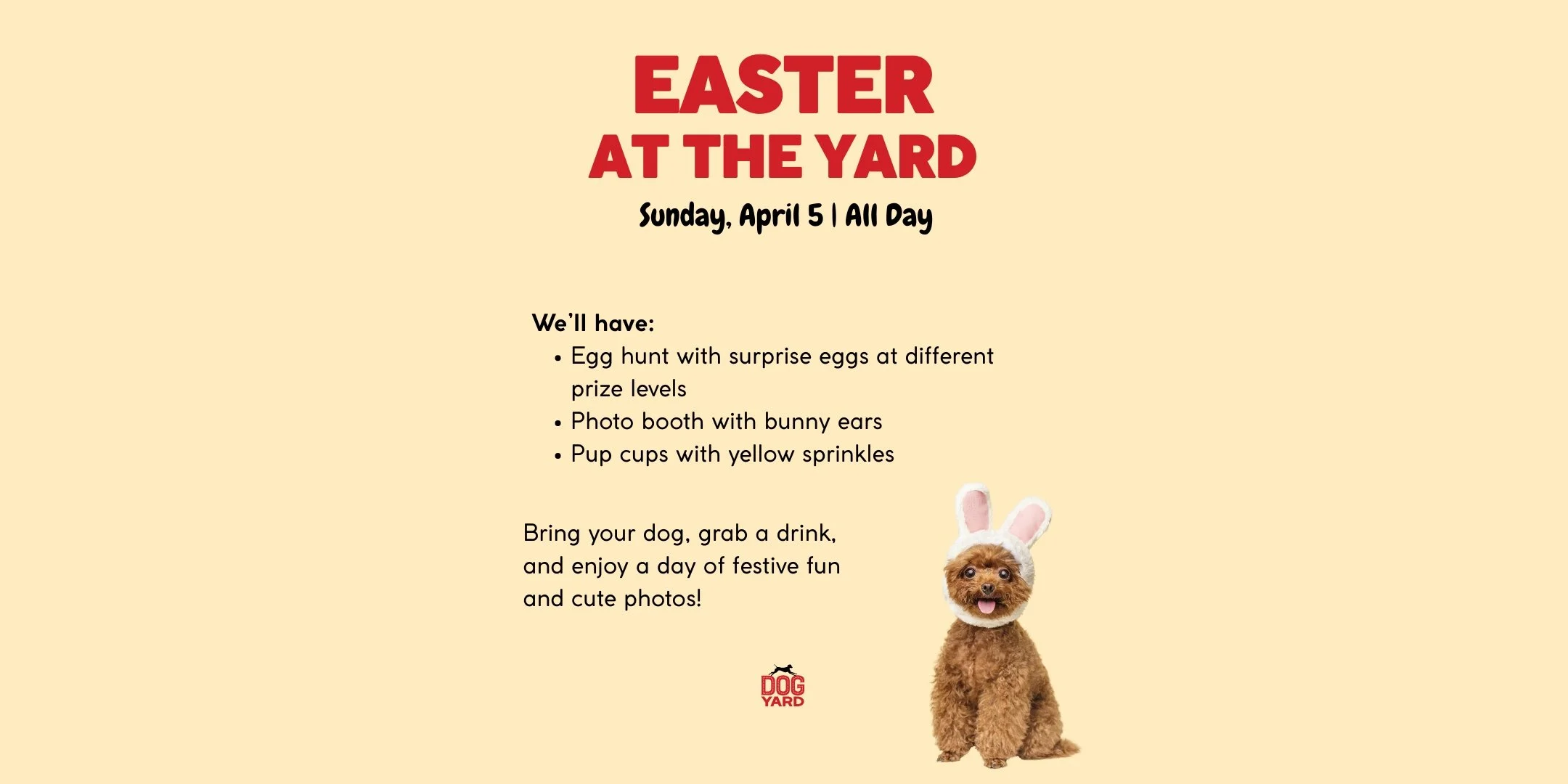 Easter fun is coming to Dog Yard Bar on Sunday, April 5, and your pup is invited to celebrate all day long (12-8 pm). We’ll have an Easter egg hunt with surprise eggs at different prize levels, a photo booth with bunny ears, and pup cups topped with yellow sprinkles. One egg per pup for the hunt. Come by for the cute pics, the festive treats, and a little Easter fun at the yard.